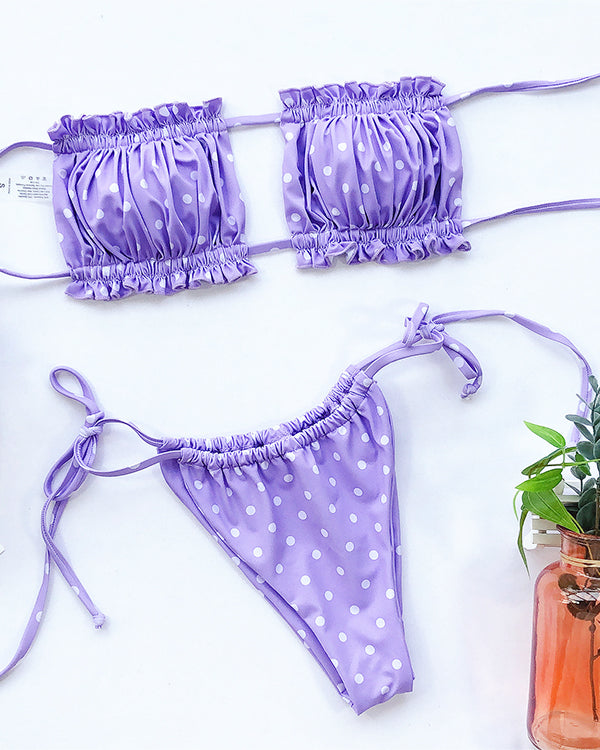 POLKA DOTS PRINT RUFFLED BANDEAU TIE SIDE BIKINI SETS